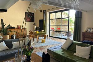 La maison est distribuée de façon très aérienne, chacun peut se trouver un coin de détente dans la bibliothèque, au coin du feu, en extérieur sous une terrasse ombragée , sur un parquet de Yoga dans la prairie, ou encore s’étirer dans la salle voutée à l’abri de la chaleur en été.